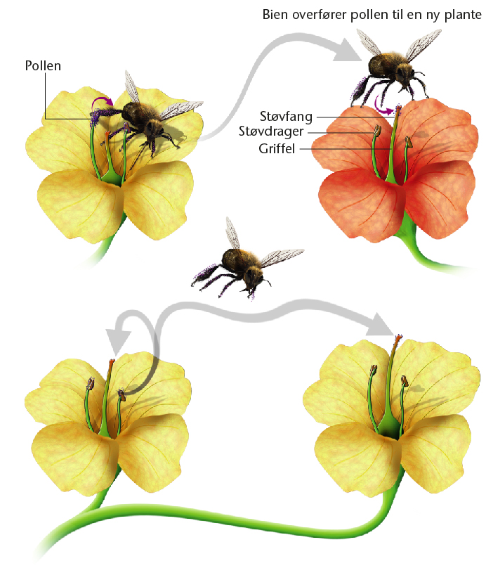 b. Selvbestøvning inden for samme blomst og hjemmebestøvning mellem to blomster på samme plante kan fx ske via vind eller ved et insekt.