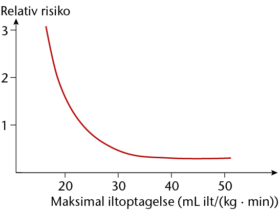 Risiko for tidlig død sammenholdt med konditallet hos 50-årige svenske mænd. Y-aksen er et forholdstal der sammenligner risikoen hos grupper med forskelligt kondital med risikoen hos den -generelle svenske befolkning af 50-årige mænd. Kilde: Recept på motion, 2003.