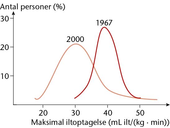 Midaldrende danske mænds kondital i 2000 sammenlignet med 1967. Faldet i mændenes kondital i perioden afspejler faldet i fysisk aktivitet.