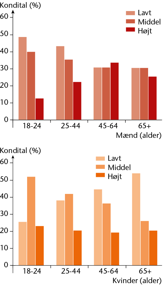 Andel af mænd og kvinder i forskellige alders-grupper med et lavt, middel eller højt kondital.