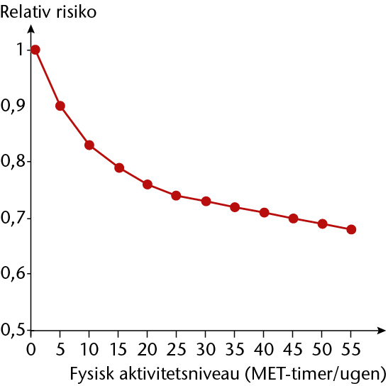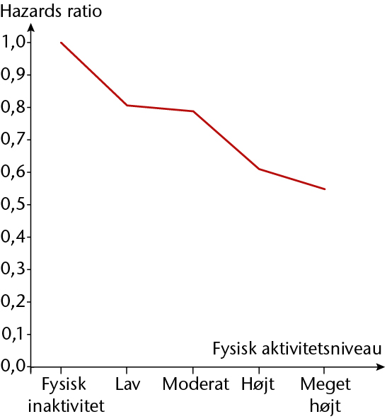 Den relative risiko for at udvikle hjerte-kar-sygdomme ved forskellige aktivitetsniveauer. Risikoen ved fysisk inaktivitet, kaldet Hazards ratio, er en referenceværdi, her sat til 1,0 ved fysisk inaktivitet.