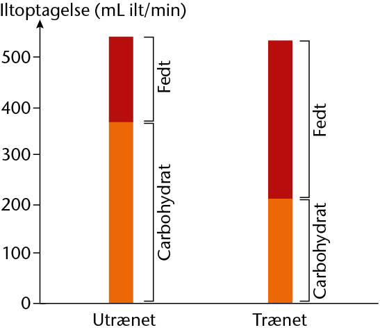 Respiration af fedt og carbohydrat i et utrænet og et trænet ben under 2 timers arbejde.