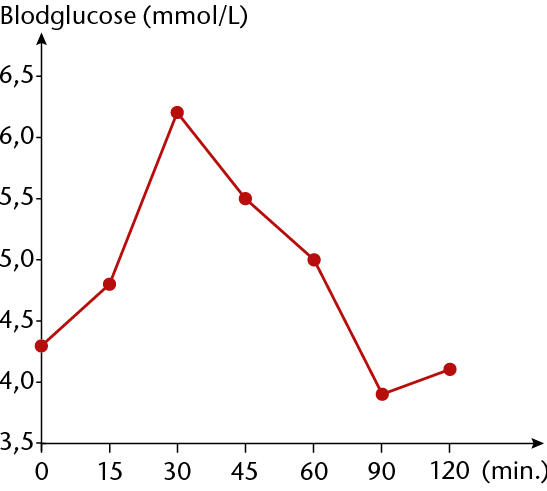 Blodets indhold af glucose efter indtag af 100 gram franskbrød. Bemærk at der først sker en stigning og efterfølgende et fald.