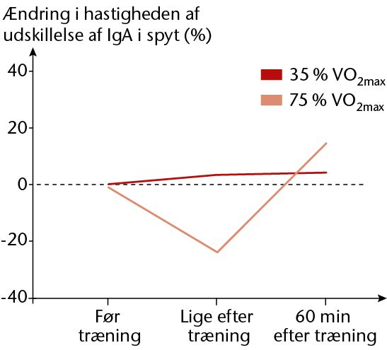 Effekter af forskellige træningsintensiteter på IgA i spyttet. Træningsintensiteterne var på hhv. 35 og 75 % af maksimal iltoptagelse. IgA blev målt som den procentvise ændring i hastigheden, hvormed IgA blev udskilt i spyttet.