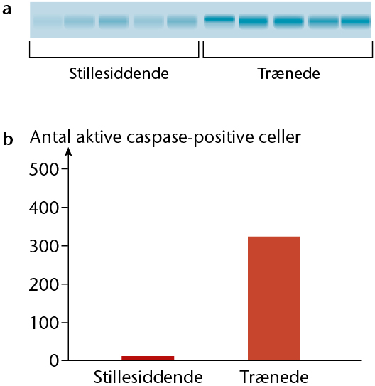 b. Antallet af celler med caspase-aktivitet var signifikant højere i tumorer fra mus der trænede, end i utrænede mus.
