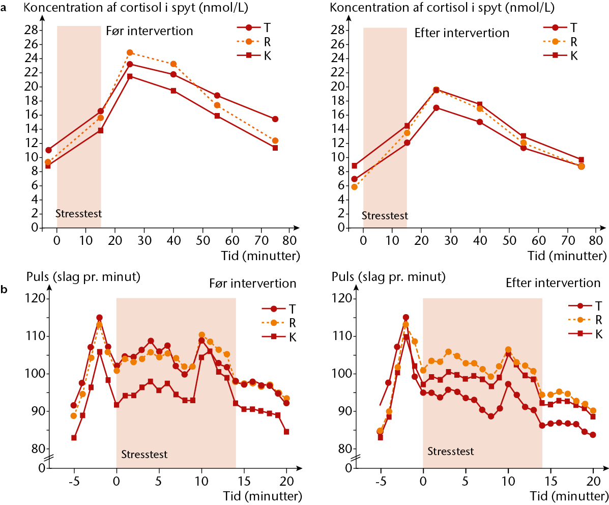b. Gennemsnitlig puls før, under og efter den psykosociale stressfaktor for de samme grupper. Forsøget viser at udholdenhedstræningen dæmper stressreaktionen både mht. puls og udskillelsen af cortisol. Afslapningstræning havde signifikant effekt på cortisol, men ikke puls.