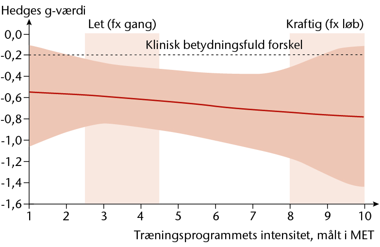 Dosis-respons-kurve der viser effekten som funktion af intensiteten af den fysiske aktivitet. Bemærk at behandlingseffekten er højere, jo lavere Hedges g-værdien er. Den røde linje er en tendenslinje, mens det farvede felt der omgiver tendenslinjen angiver spredningen.