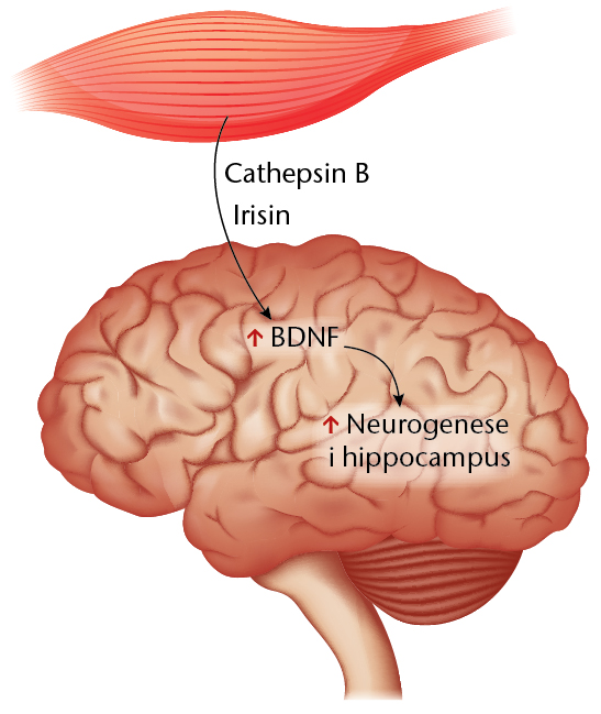 Cathepsin B og irisin kan passere blod-hjerne-barrieren og øge produktionen af BDNF i hippocampus, hvilket øger neurogenesen.