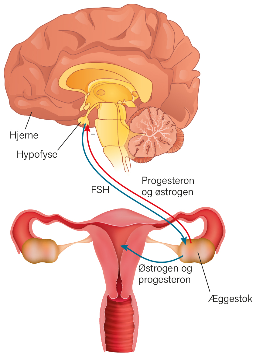 Regulering af kønshormoner. Ved ægløsning og evt. befrugtning vil store mængder af østrogen og progesteron hæmme dannelsen a FSH (vist med et minus). Befrugtes ægget ikke, vil produktionen af østrogen og progesteron falde, og livmorslimhinden gå til grunde – der kommer en blødning. Hæmningen af FSH vil også ophøre, produktionen stiger igen, og en ny cyklus med ægmodning begynder. Hormonet LH der bevirker ægløsningen, er ikke vist på figuren.
