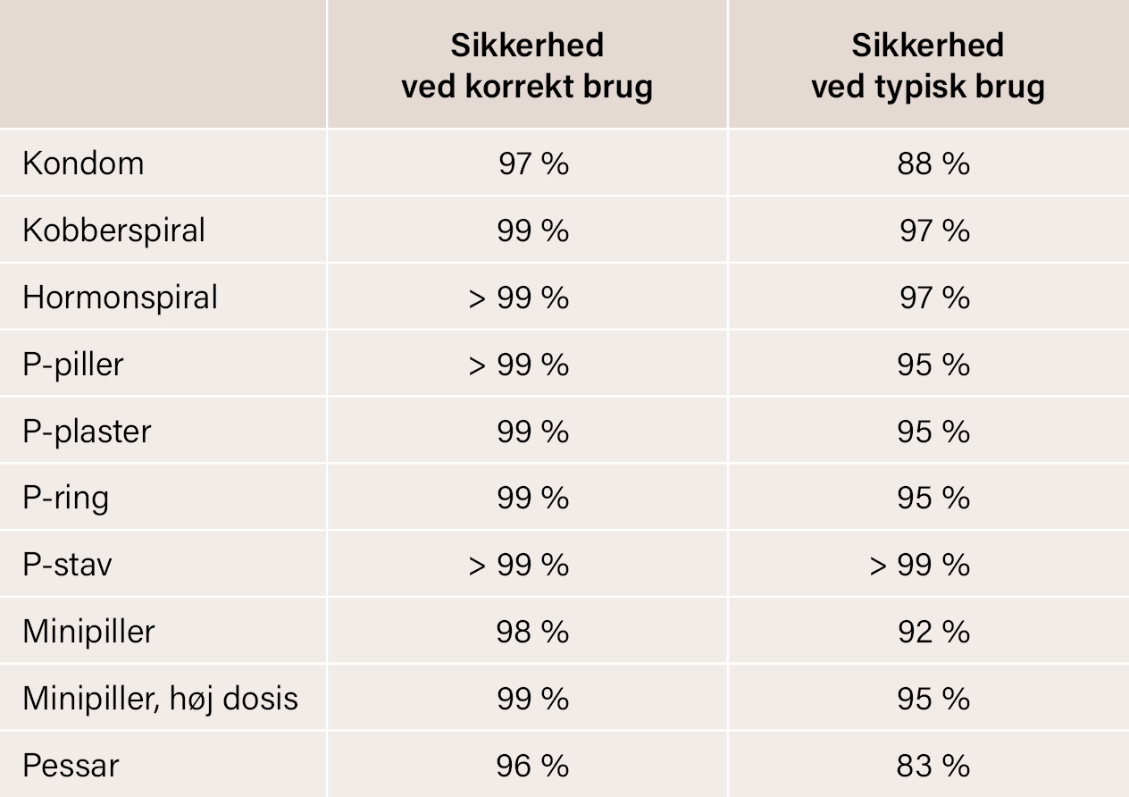 Oversigt over sikkerhed ved brug af forskellige former for prævention. Sikkerheden ved typisk brug er lavere end ved korrekt brug.
