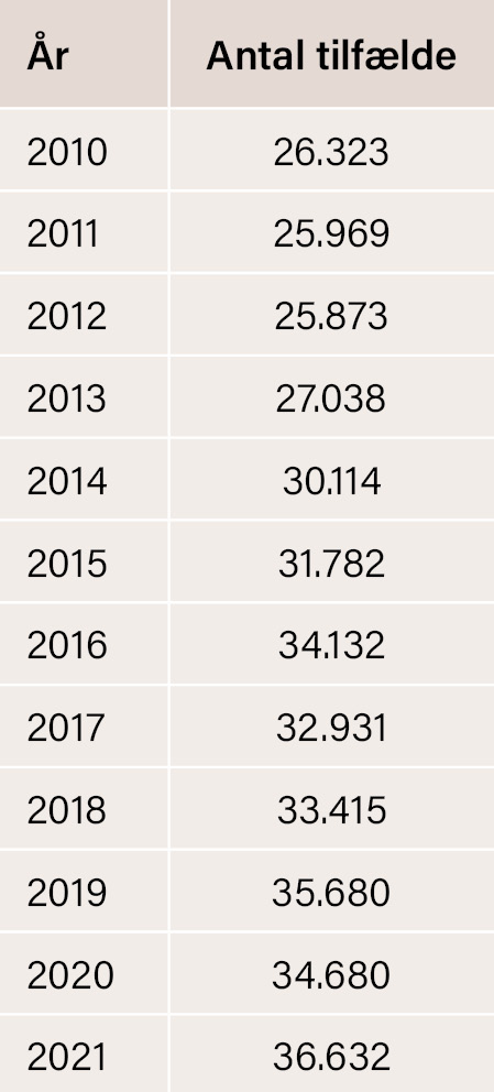 Antal personer der er testet positiv for klamydia i årene 2010-2021.